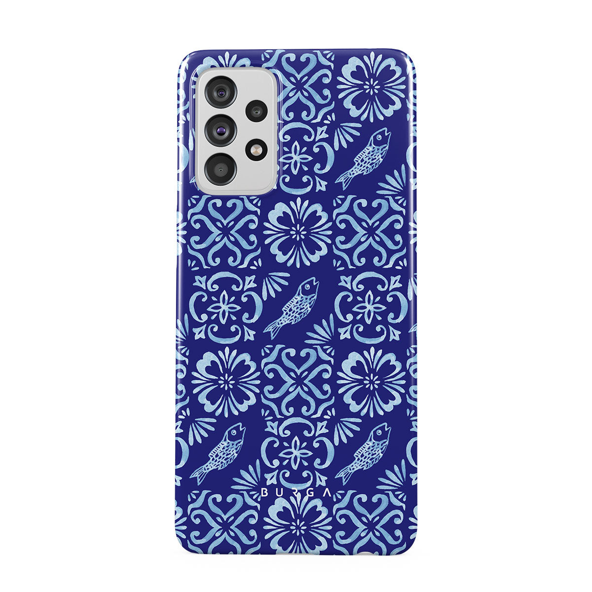 このデザインの特徴:ポルトガルのタイル模様、深い青、花柄、花、魚