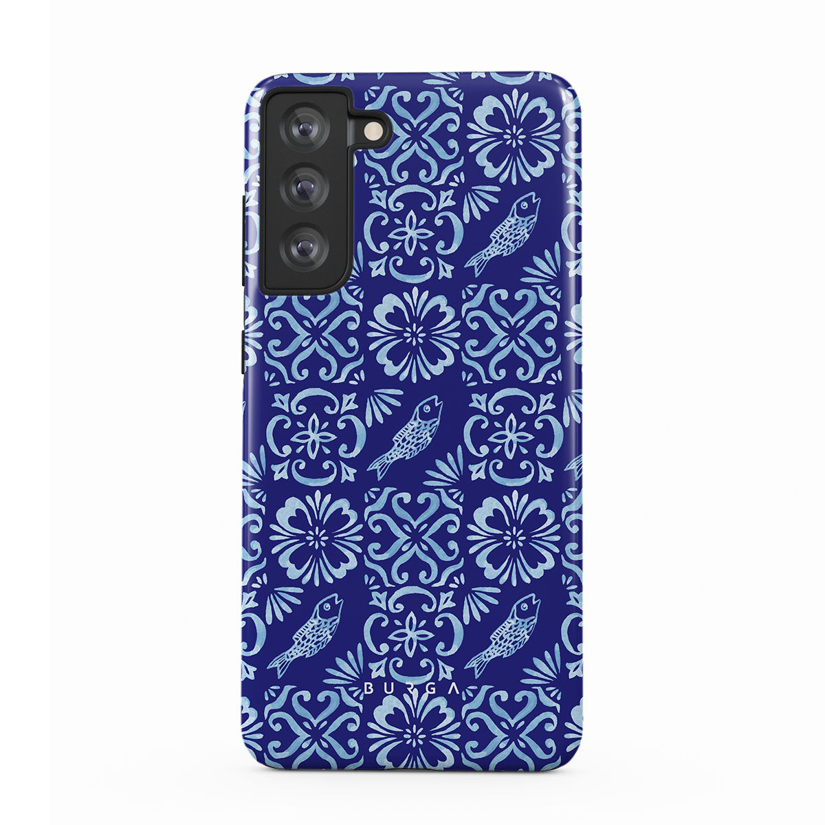 このデザインの特徴:ポルトガルのタイル模様、深い青、花柄、花、魚