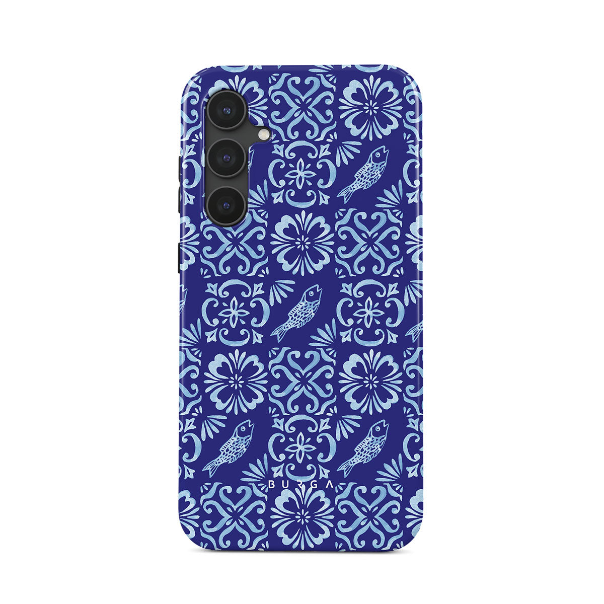 このデザインの特徴:ポルトガルのタイル模様、深い青、花柄、花、魚
