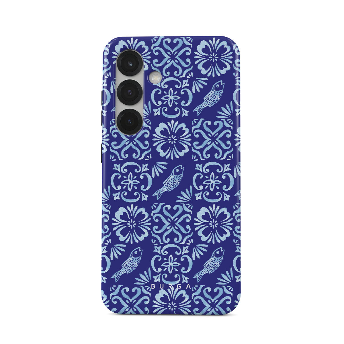 このデザインの特徴:ポルトガルのタイル模様、深い青、花柄、花、魚