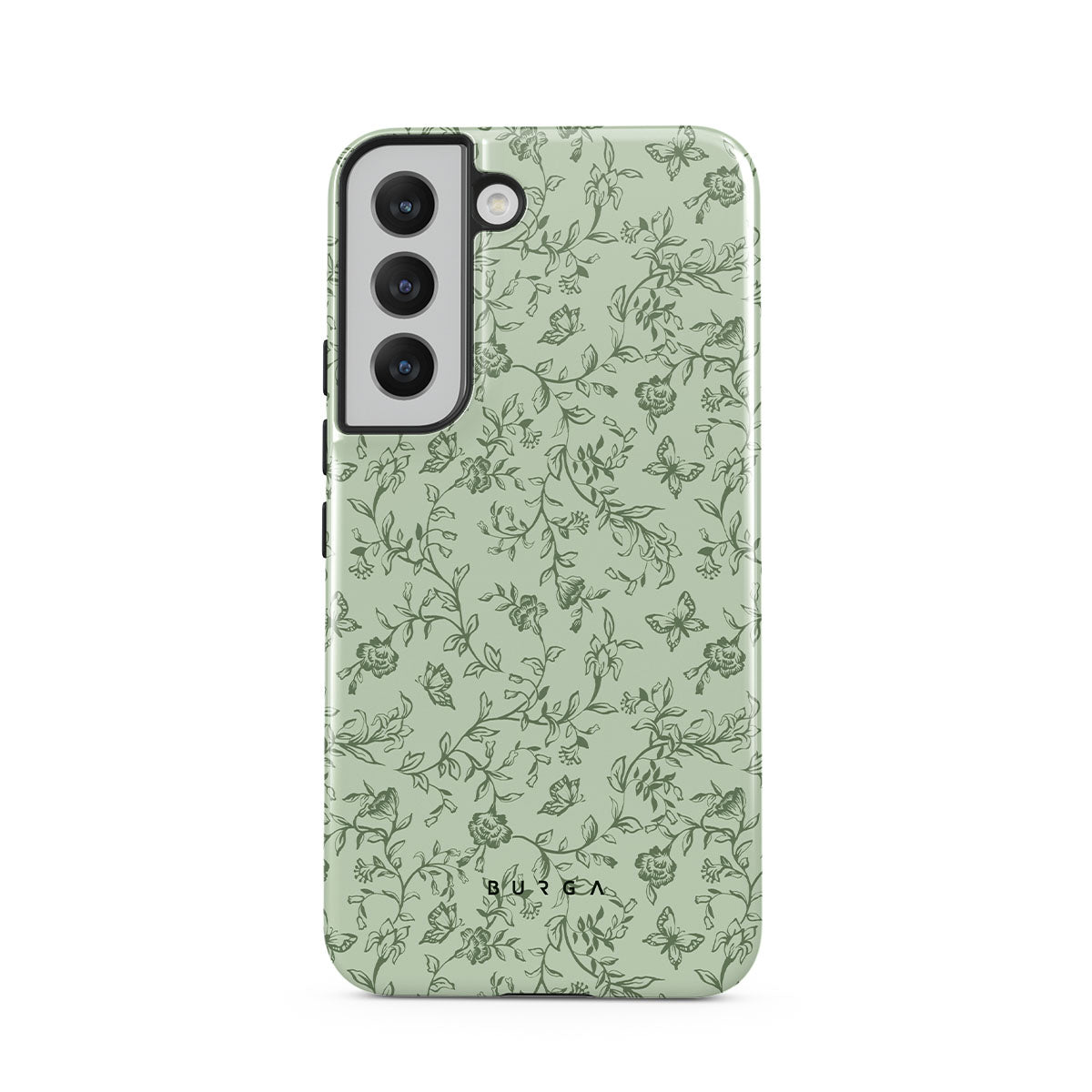 このデザインの特徴緑のフローラルパターン、花、蝶