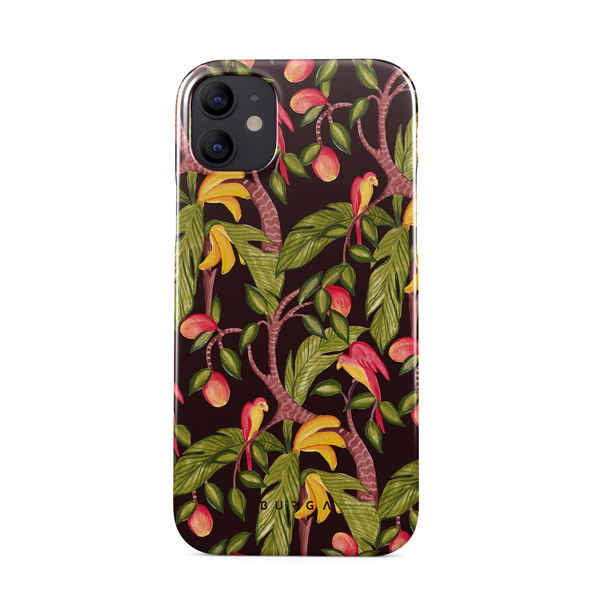 このデザインの特徴:マンゴー、ダークグリーンの葉、ジャングルインスパイアパターン