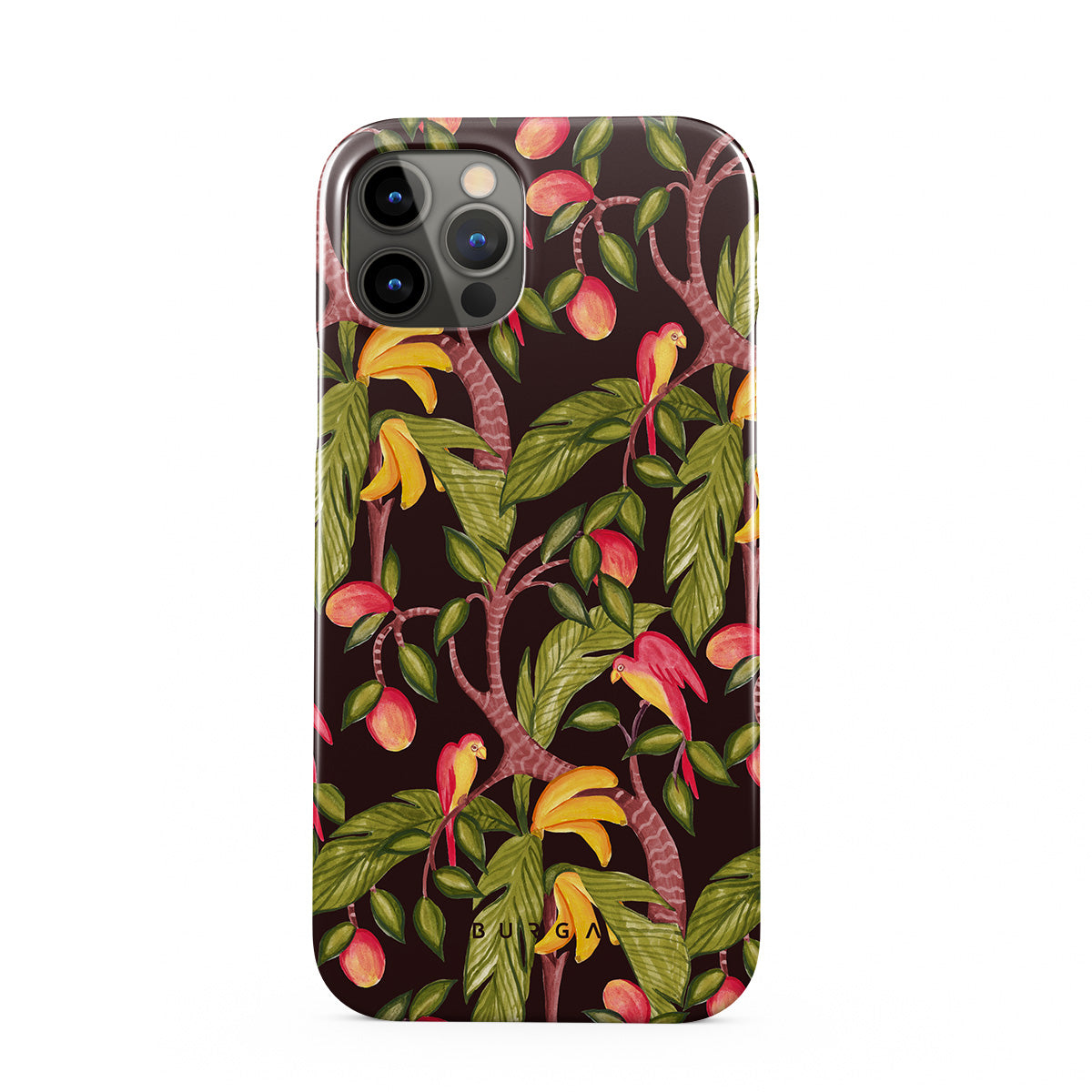 このデザインの特徴:マンゴー、ダークグリーンの葉、ジャングルインスパイアパターン
