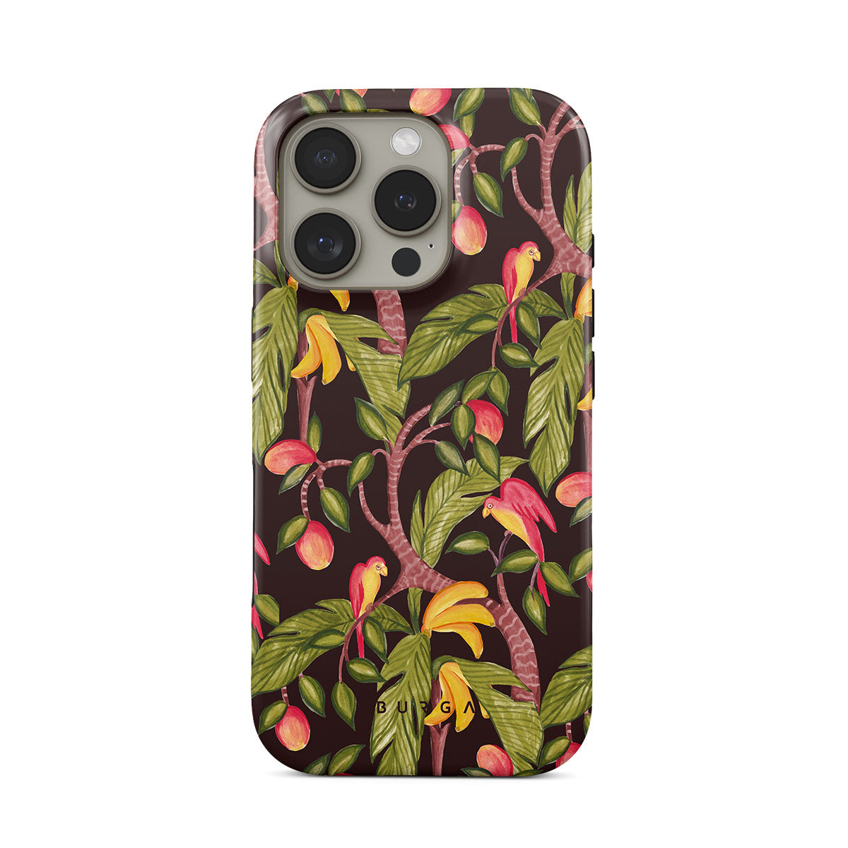 このデザインの特徴:マンゴー、ダークグリーンの葉、ジャングルインスパイアパターン