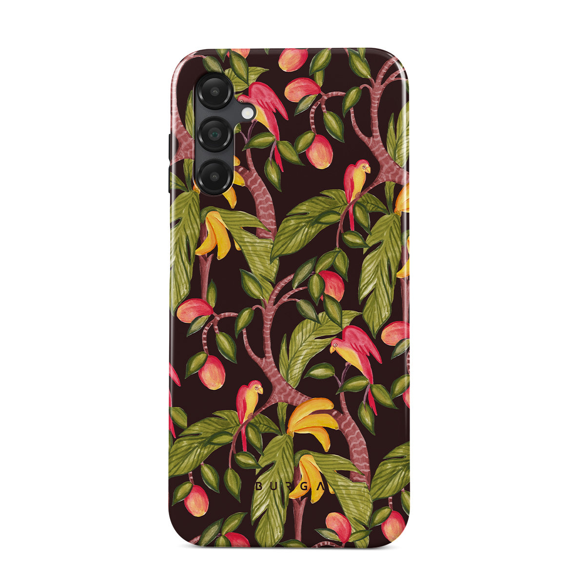 このデザインの特徴:マンゴー、ダークグリーンの葉、ジャングルインスパイアパターン