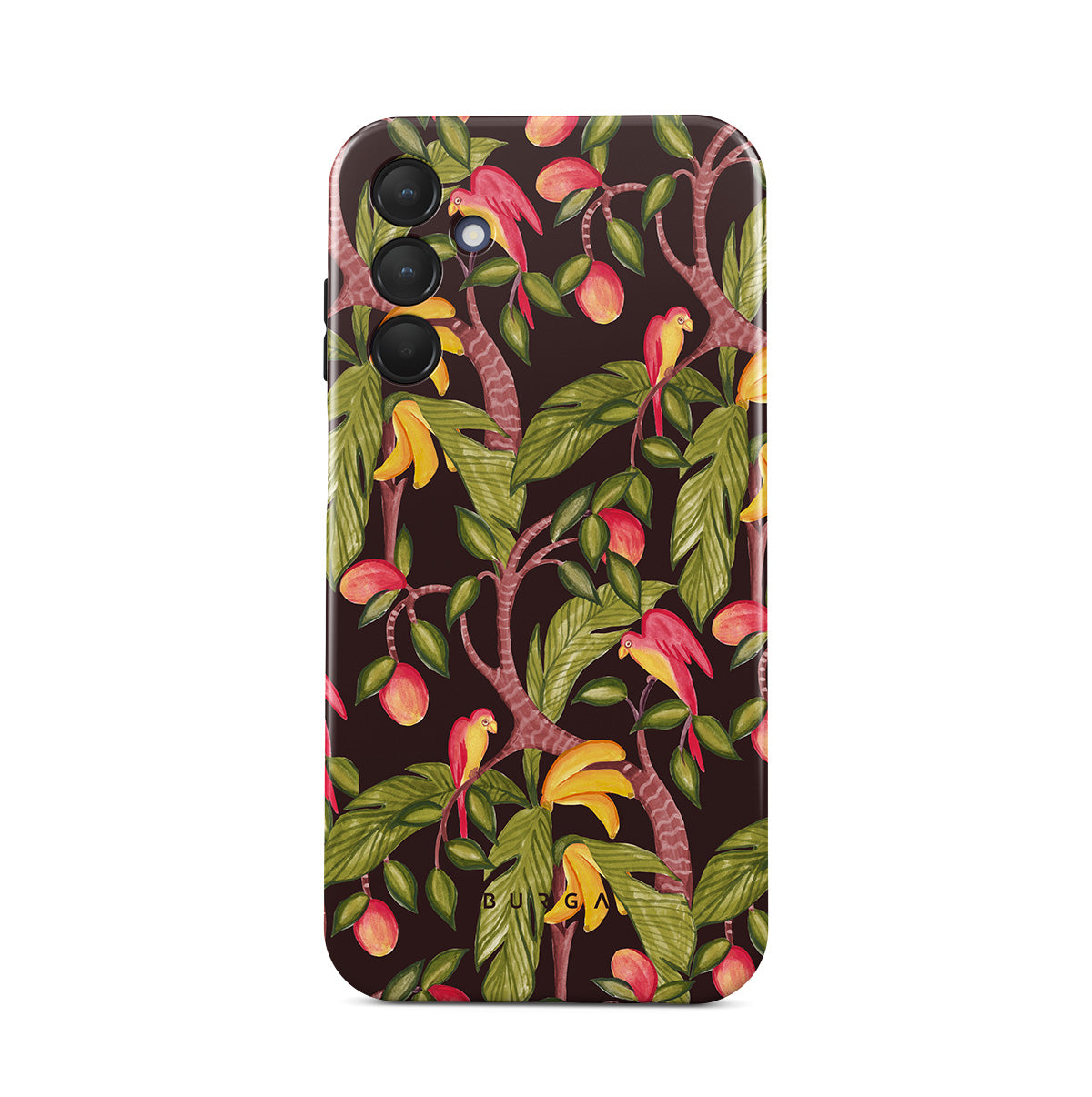 このデザインの特徴:マンゴー、ダークグリーンの葉、ジャングルインスパイアパターン