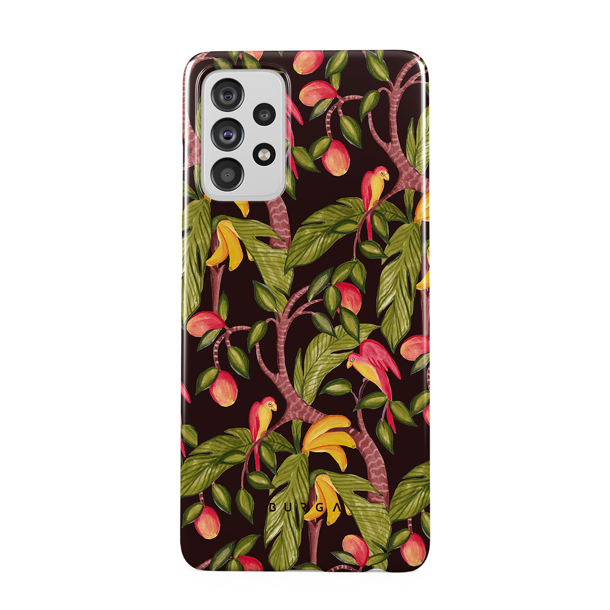 このデザインの特徴:マンゴー、ダークグリーンの葉、ジャングルインスパイアパターン