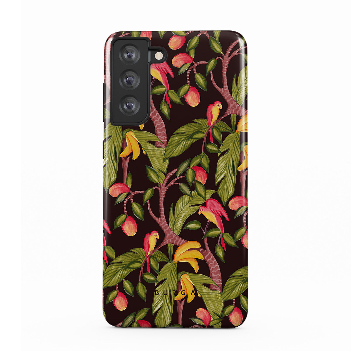このデザインの特徴:マンゴー、ダークグリーンの葉、ジャングルインスパイアパターン