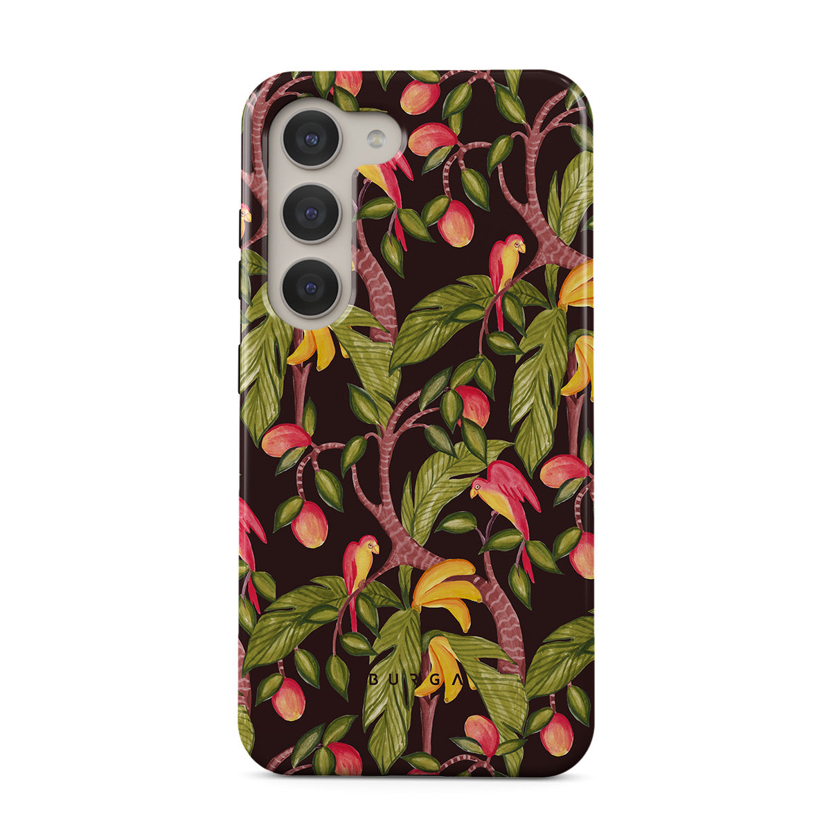 このデザインの特徴:マンゴー、ダークグリーンの葉、ジャングルインスパイアパターン