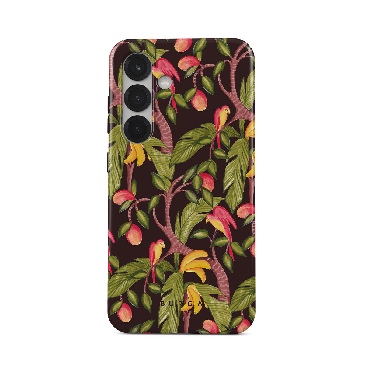 このデザインの特徴:マンゴー、ダークグリーンの葉、ジャングルインスパイアパターン