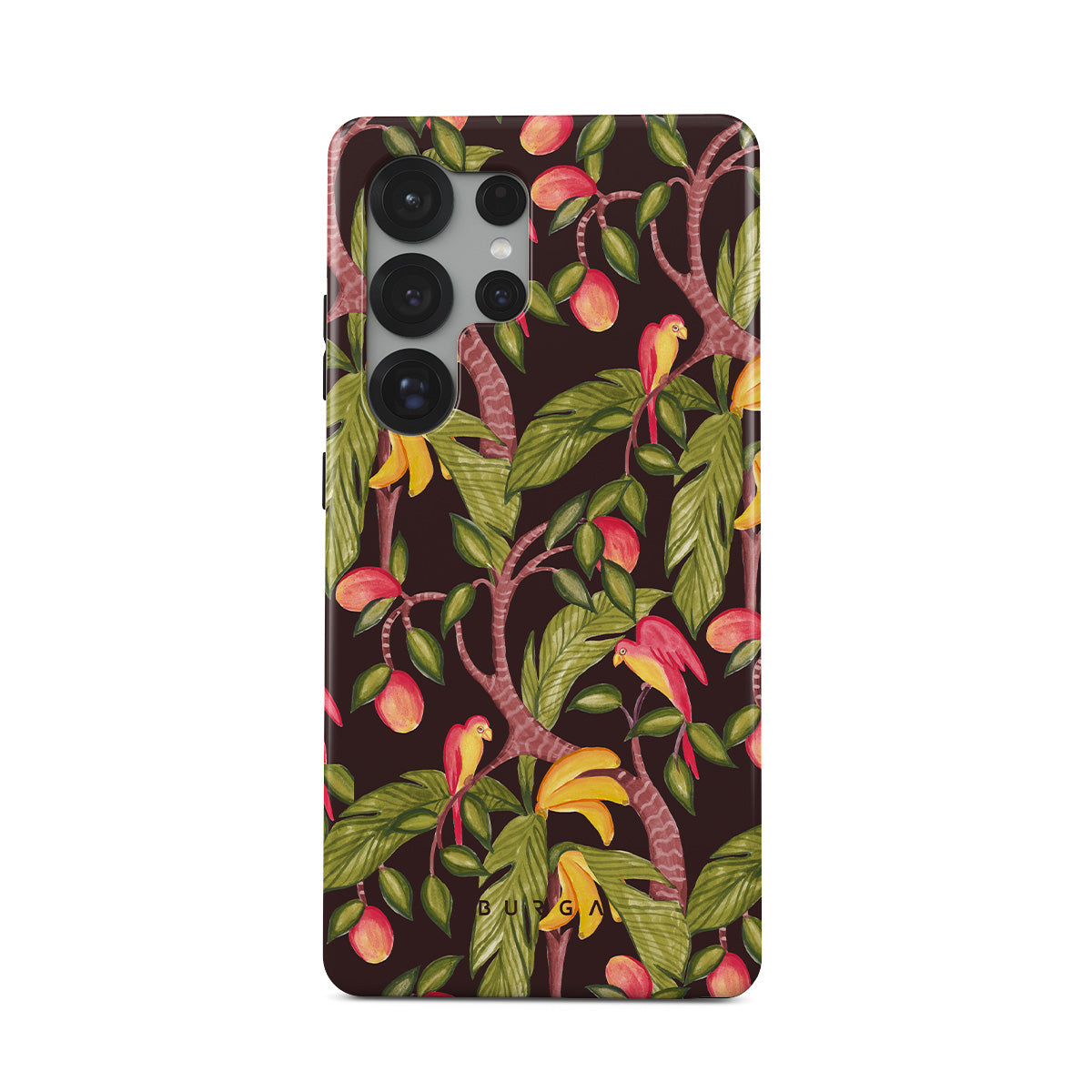 このデザインの特徴:マンゴー、ダークグリーンの葉、ジャングルインスパイアパターン