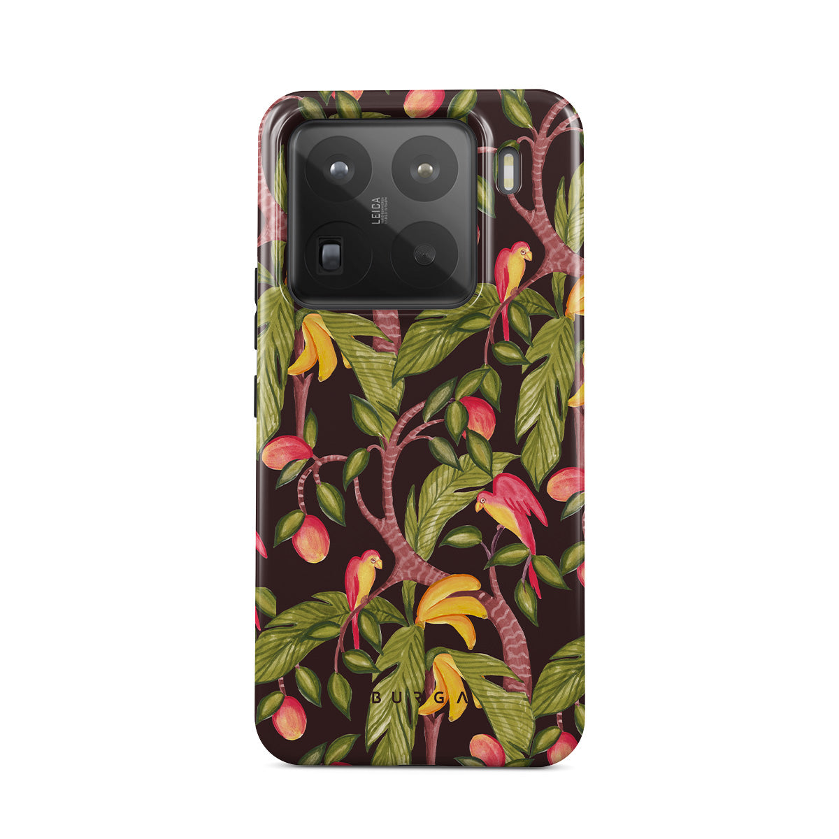 このデザインの特徴:マンゴー、ダークグリーンの葉、ジャングルインスパイアパターン