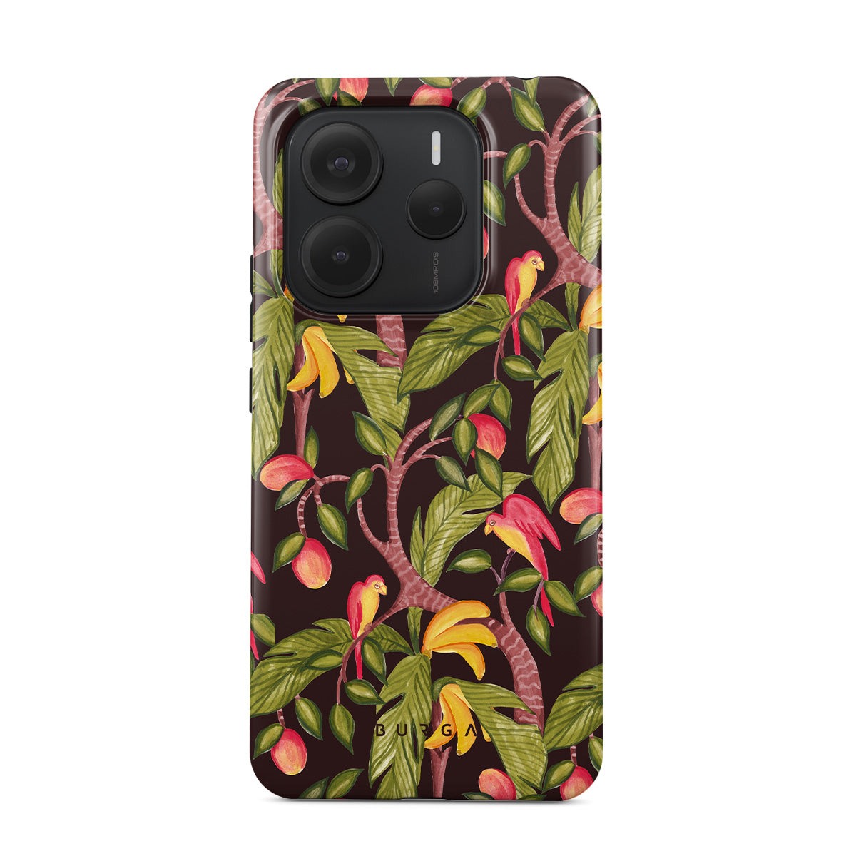 このデザインの特徴:マンゴー、ダークグリーンの葉、ジャングルインスパイアパターン