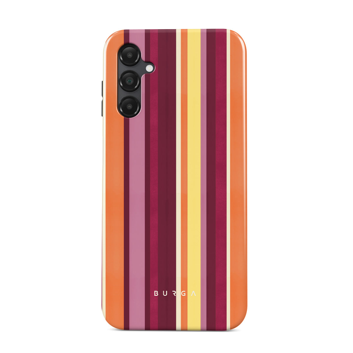 このデザインの特徴:オレンジと紫のストライプ、パッションフルーツカラー、トロピカルパターン