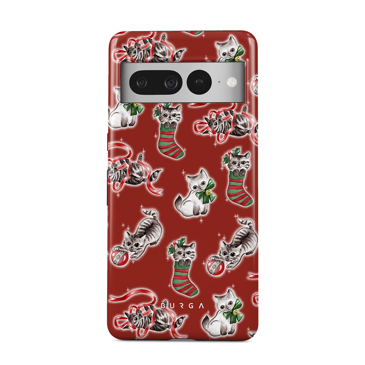 このデザインの特徴:猫、ホリデーストッキング、子猫、赤と緑のパターン、遊び心のある猫、クリスマスのオーナメント