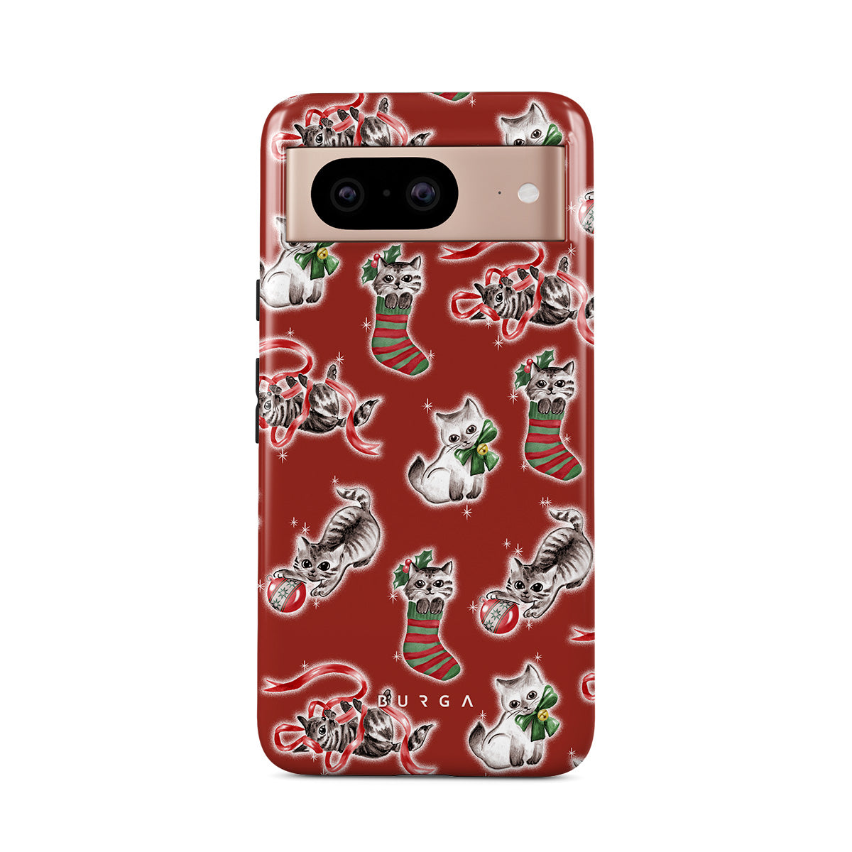 このデザインの特徴:猫、ホリデーストッキング、子猫、赤と緑のパターン、遊び心のある猫、クリスマスのオーナメント