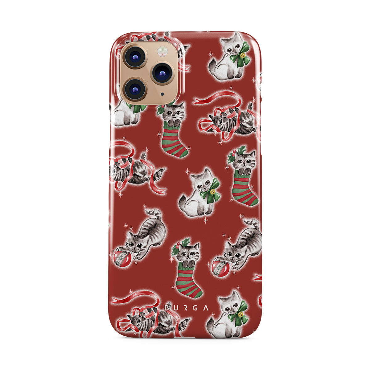 このデザインの特徴:猫、ホリデーストッキング、子猫、赤と緑のパターン、遊び心のある猫、クリスマスのオーナメント