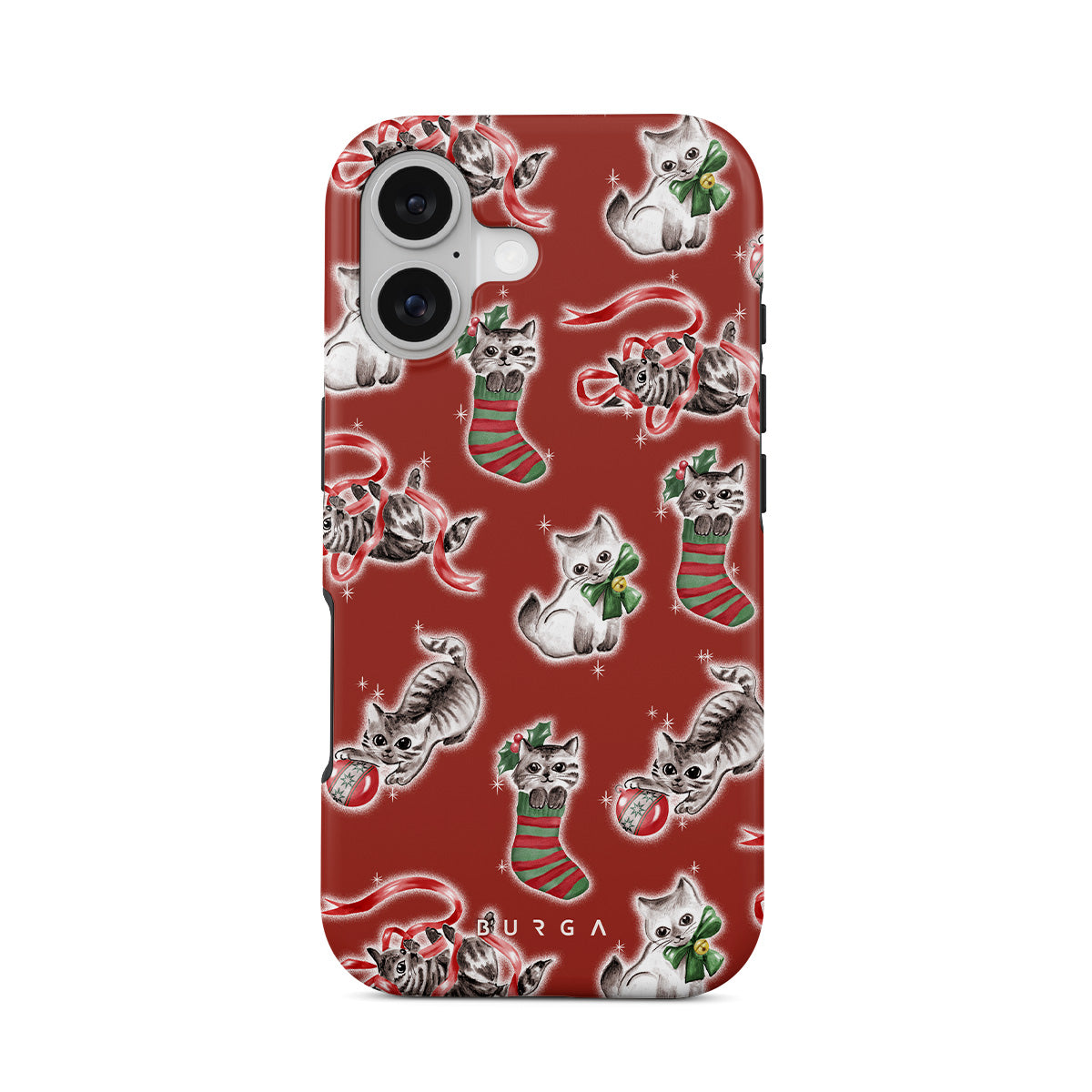 このデザインの特徴:猫、ホリデーストッキング、子猫、赤と緑のパターン、遊び心のある猫、クリスマスのオーナメント