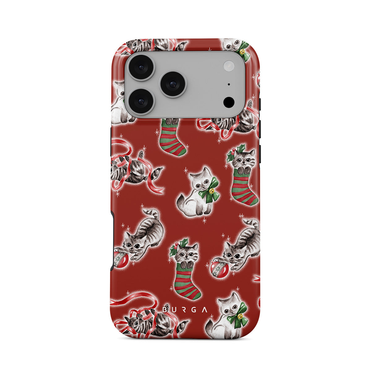 このデザインの特徴:猫、ホリデーストッキング、子猫、赤と緑のパターン、遊び心のある猫、クリスマスのオーナメント