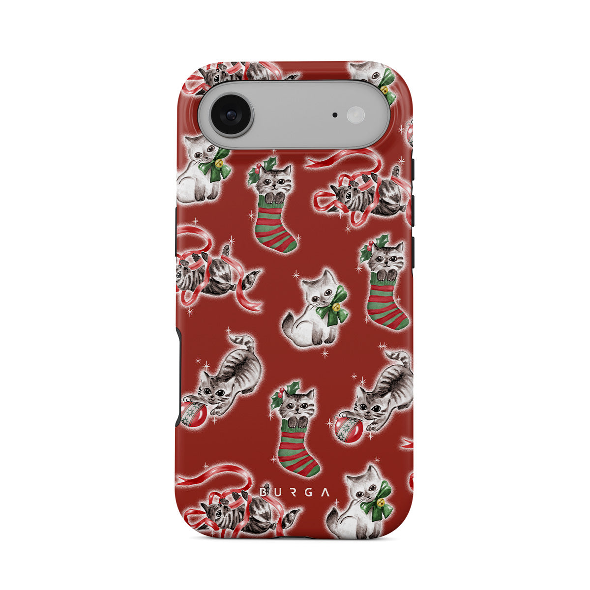 このデザインの特徴:猫、ホリデーストッキング、子猫、赤と緑のパターン、遊び心のある猫、クリスマスのオーナメント