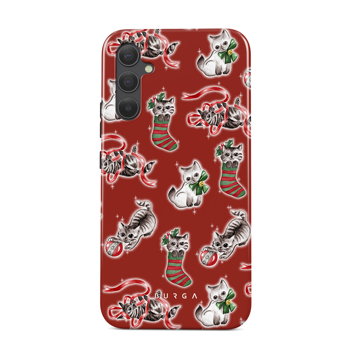 このデザインの特徴:猫、ホリデーストッキング、子猫、赤と緑のパターン、遊び心のある猫、クリスマスのオーナメント