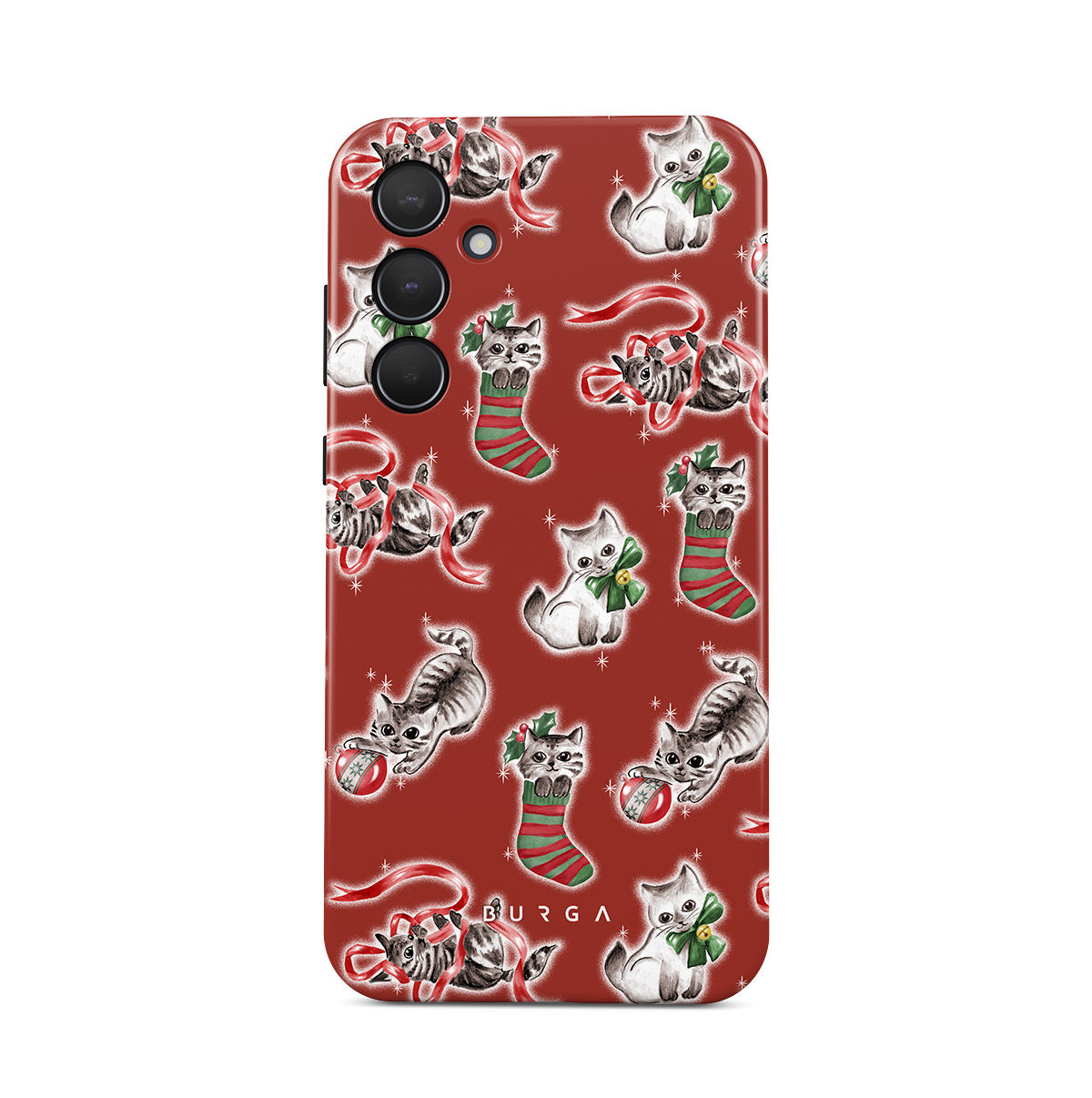 このデザインの特徴:猫、ホリデーストッキング、子猫、赤と緑のパターン、遊び心のある猫、クリスマスのオーナメント