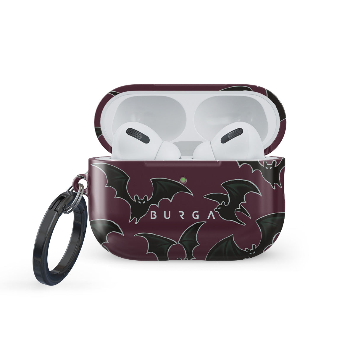 このデザインの特徴:ハロウィンテーマ、コウモリ、バーガンディの背景