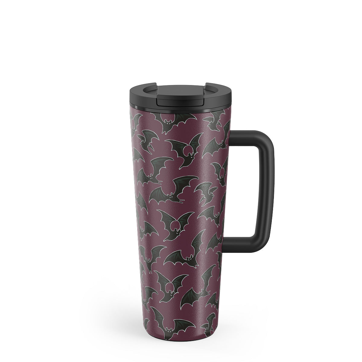 このデザインの特徴:ハロウィンテーマ、コウモリ、バーガンディの背景