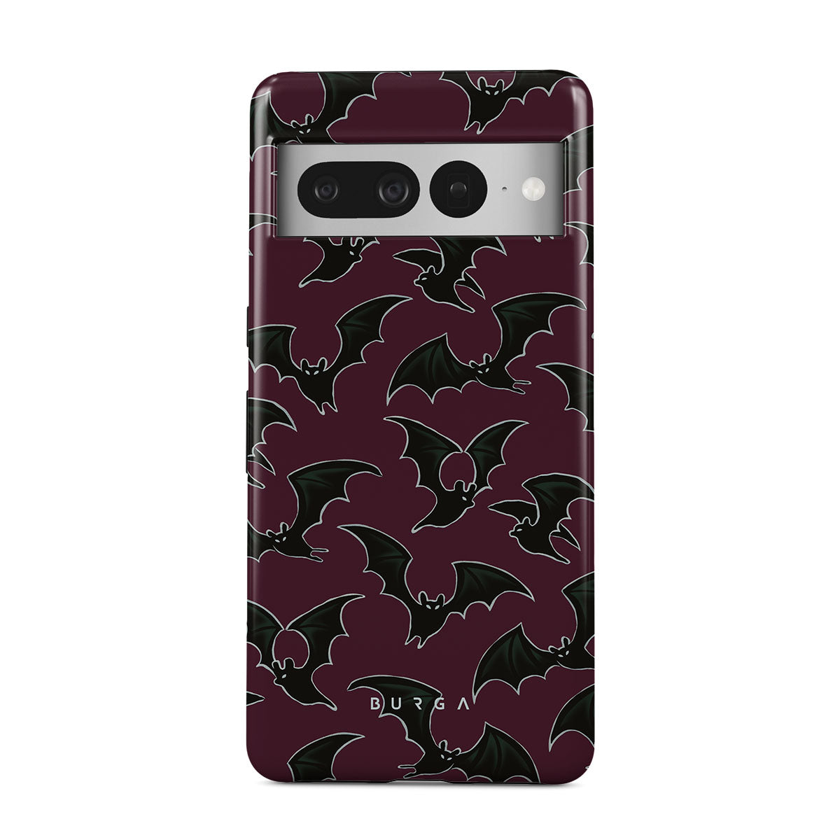 このデザインの特徴:ハロウィンテーマ、コウモリ、バーガンディの背景