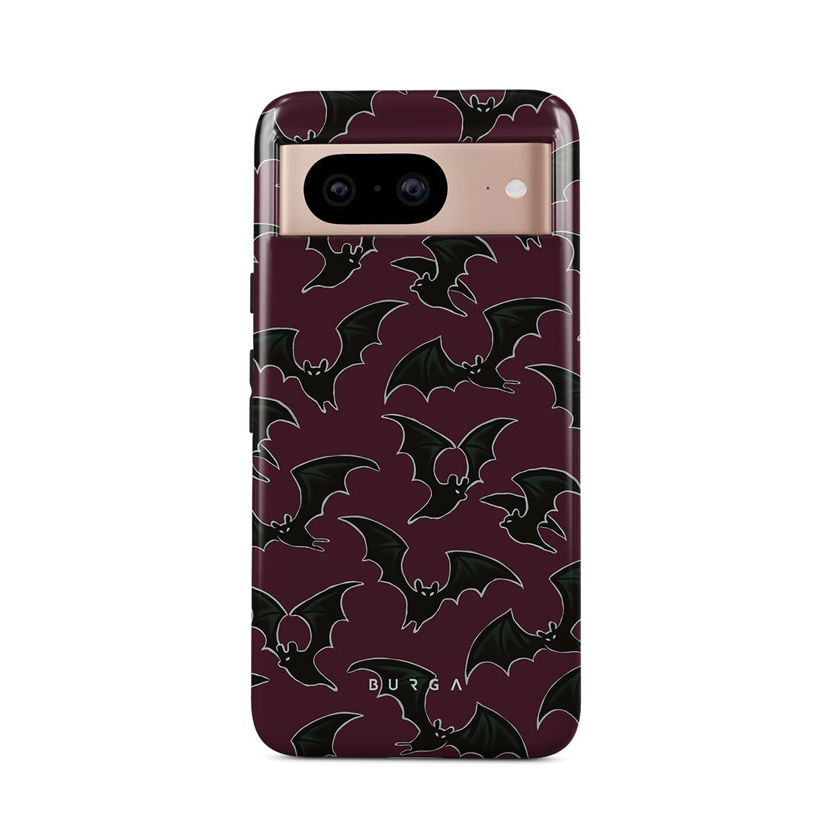 このデザインの特徴:ハロウィンテーマ、コウモリ、バーガンディの背景