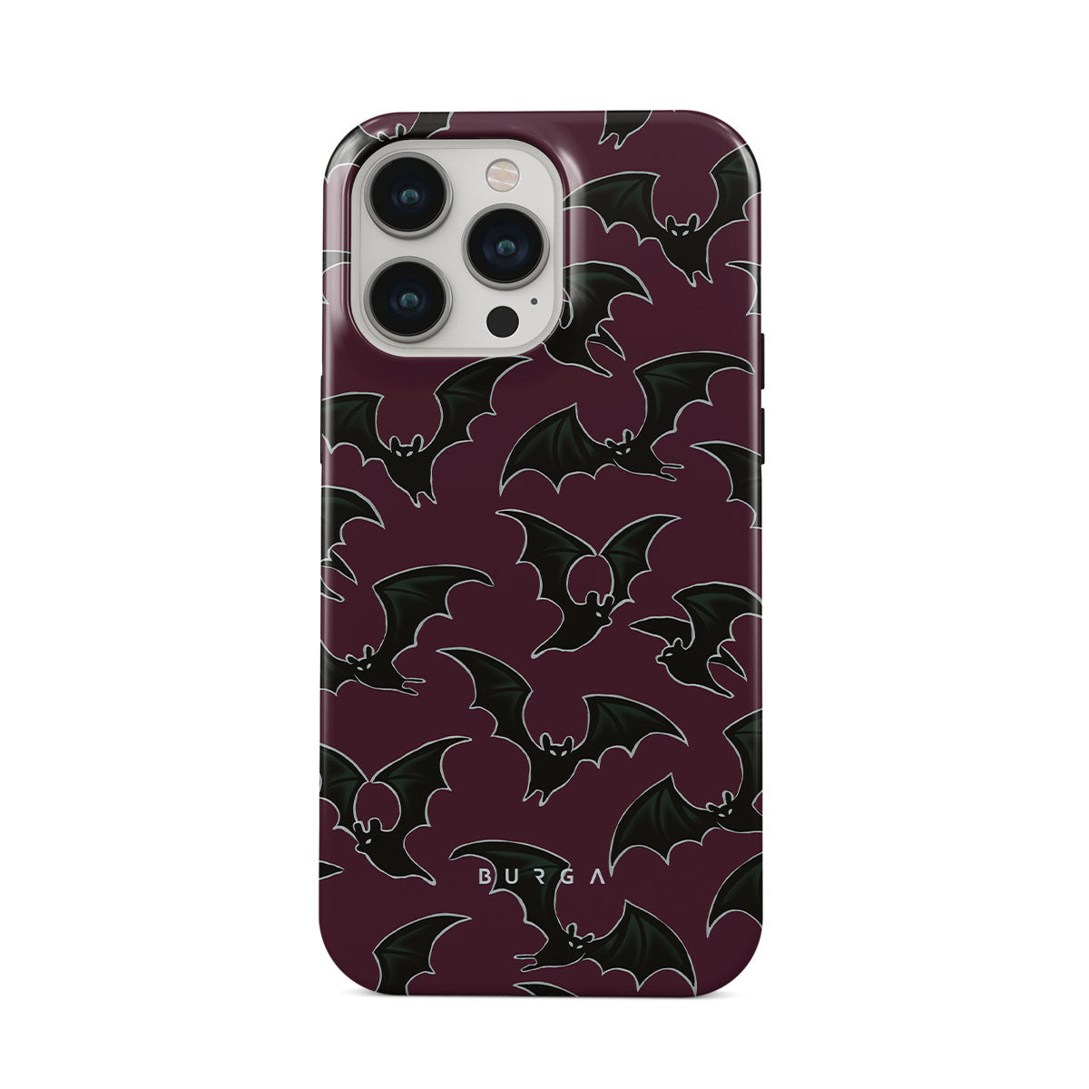 このデザインの特徴:ハロウィンテーマ、コウモリ、バーガンディの背景