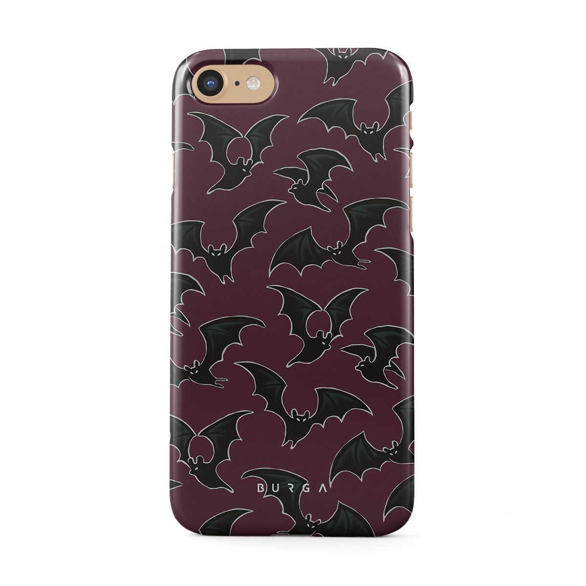 このデザインの特徴:ハロウィンテーマ、コウモリ、バーガンディの背景