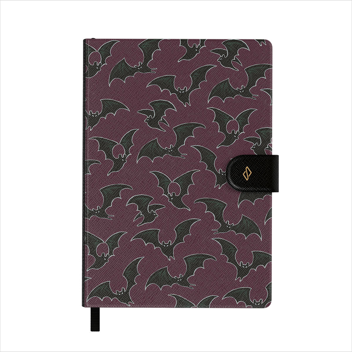 このデザインの特徴:ハロウィンテーマ、コウモリ、バーガンディの背景