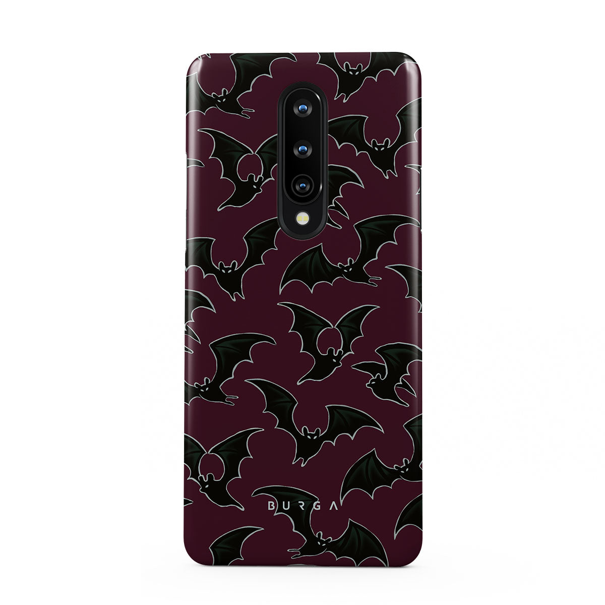 このデザインの特徴:ハロウィンテーマ、コウモリ、バーガンディの背景
