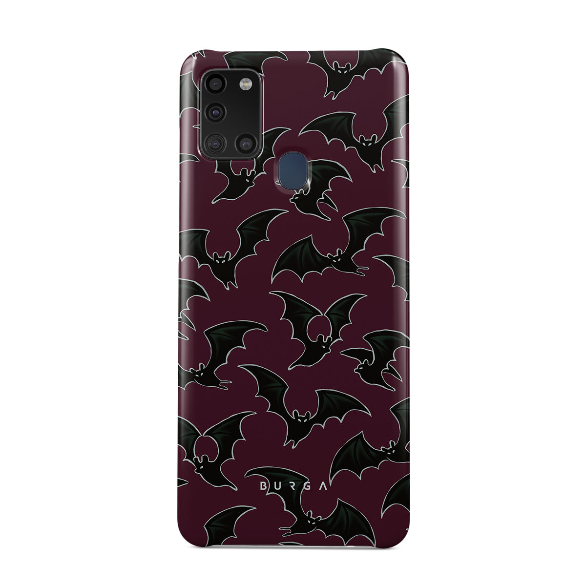 このデザインの特徴:ハロウィンテーマ、コウモリ、バーガンディの背景