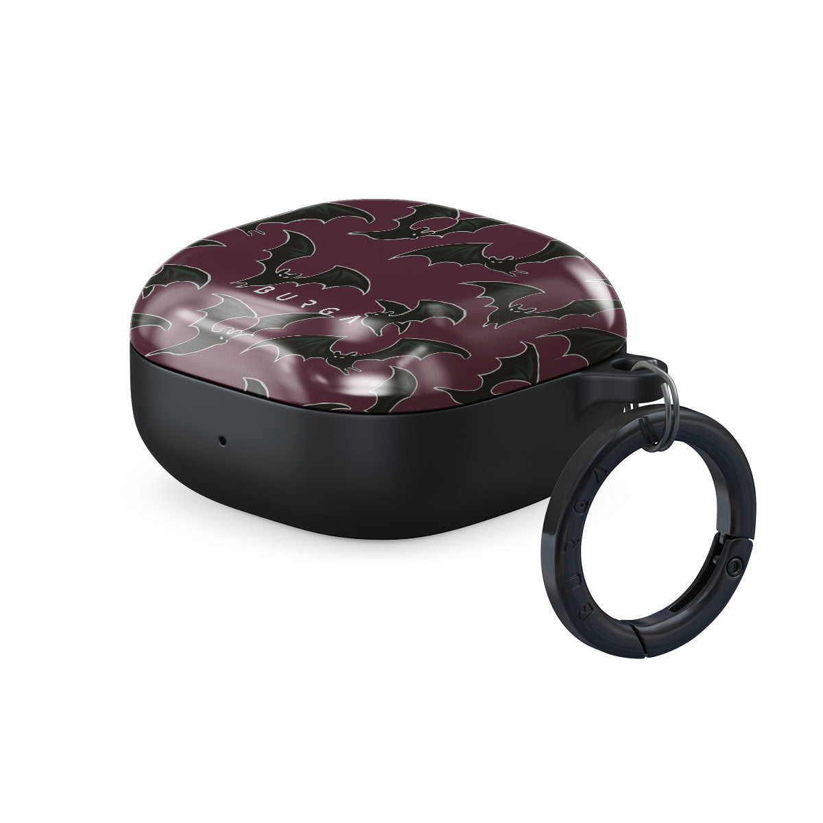 このデザインの特徴:ハロウィンテーマ、コウモリ、バーガンディの背景