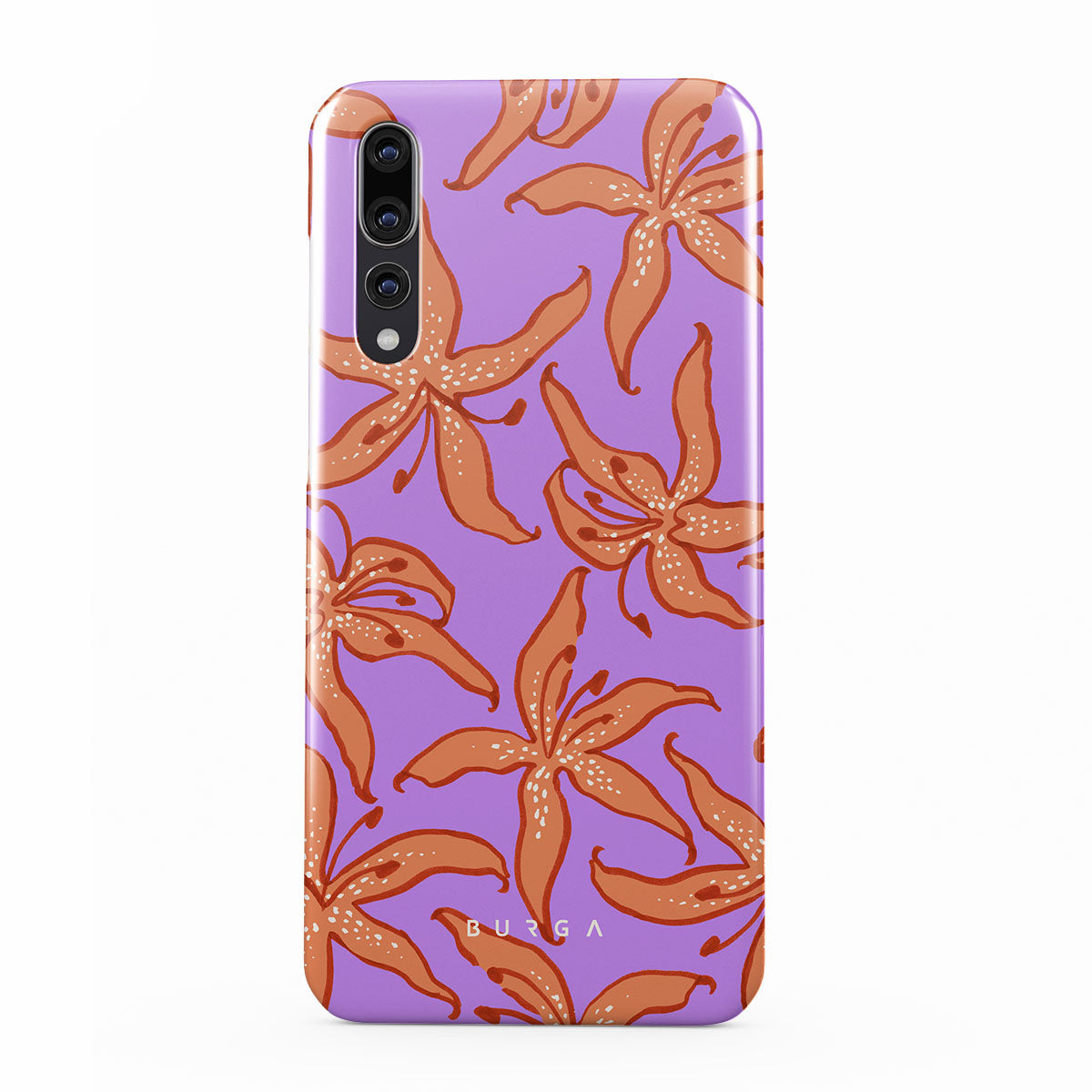 このデザインの特徴:オレンジのユリ、紫の背景があります
