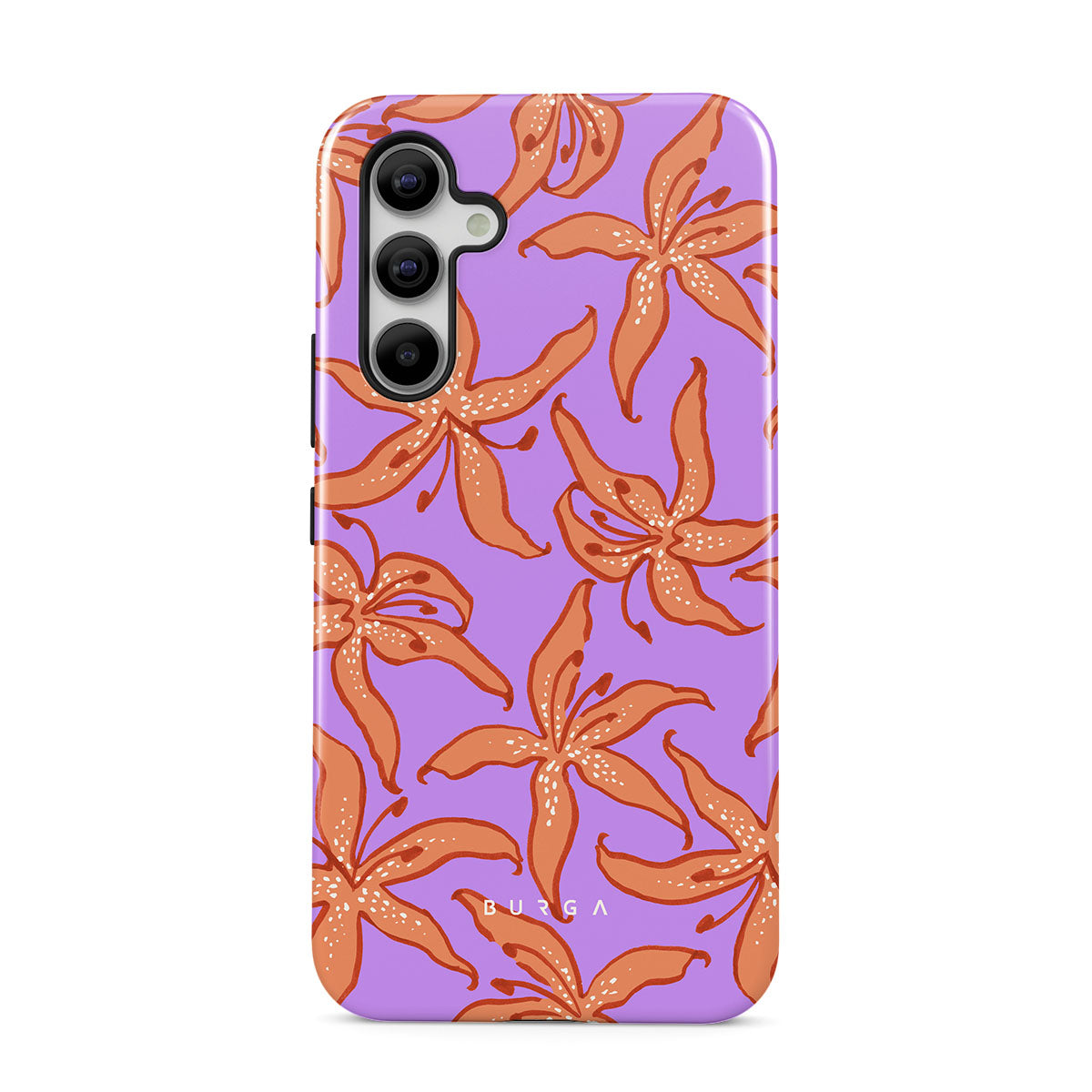 このデザインの特徴:オレンジのユリ、紫の背景があります