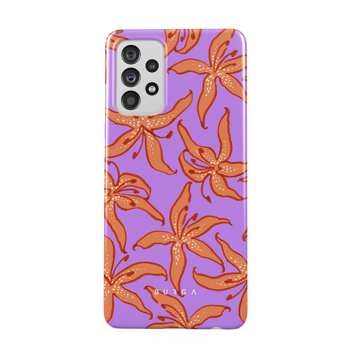 このデザインの特徴:オレンジのユリ、紫の背景があります
