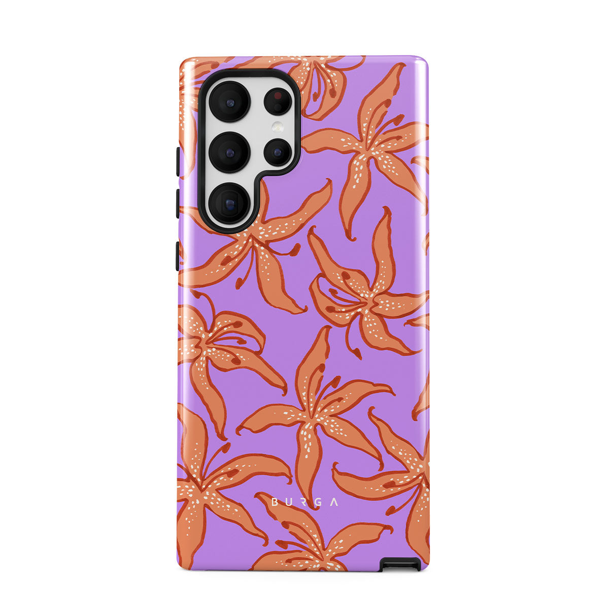 このデザインの特徴:オレンジのユリ、紫の背景があります