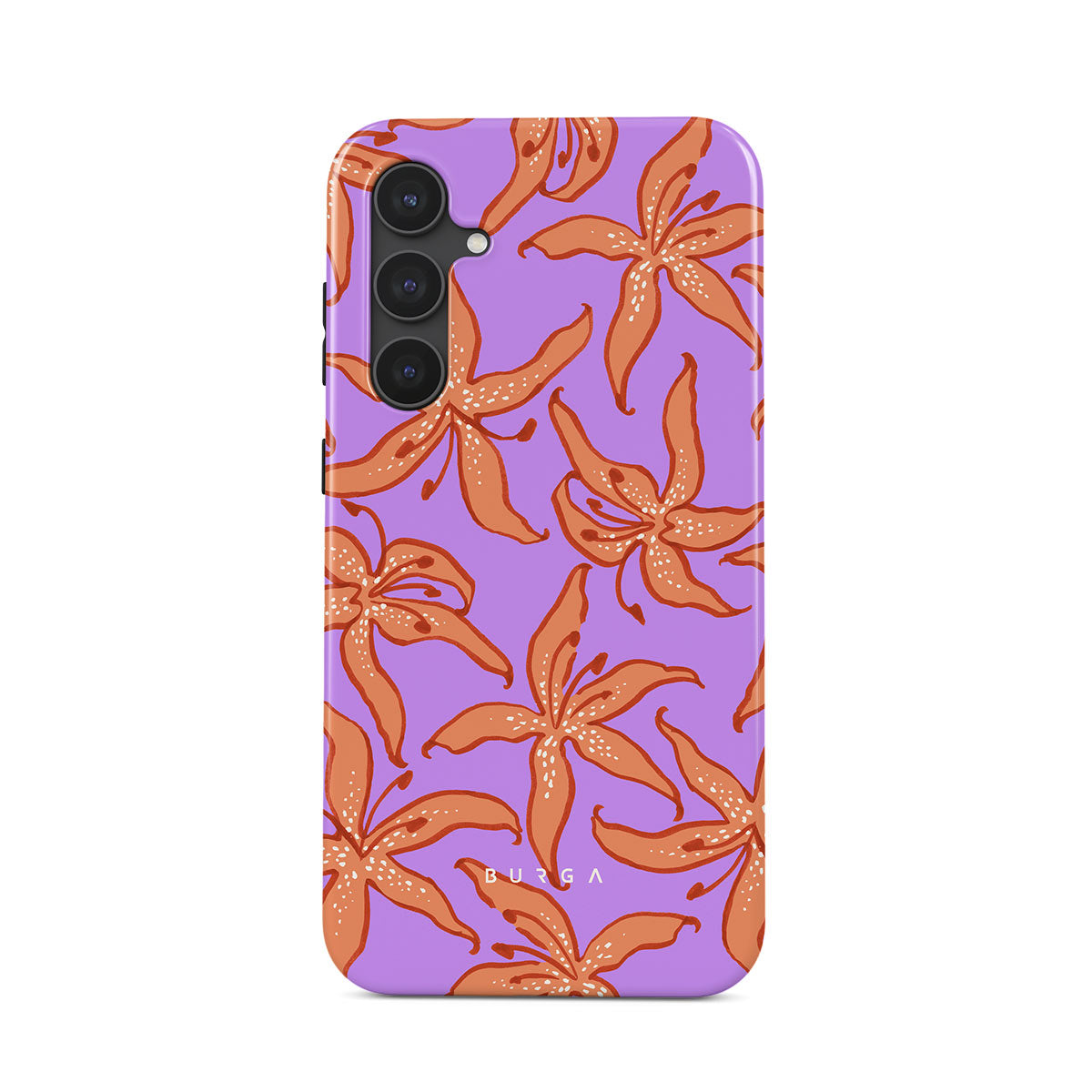 このデザインの特徴:オレンジのユリ、紫の背景があります