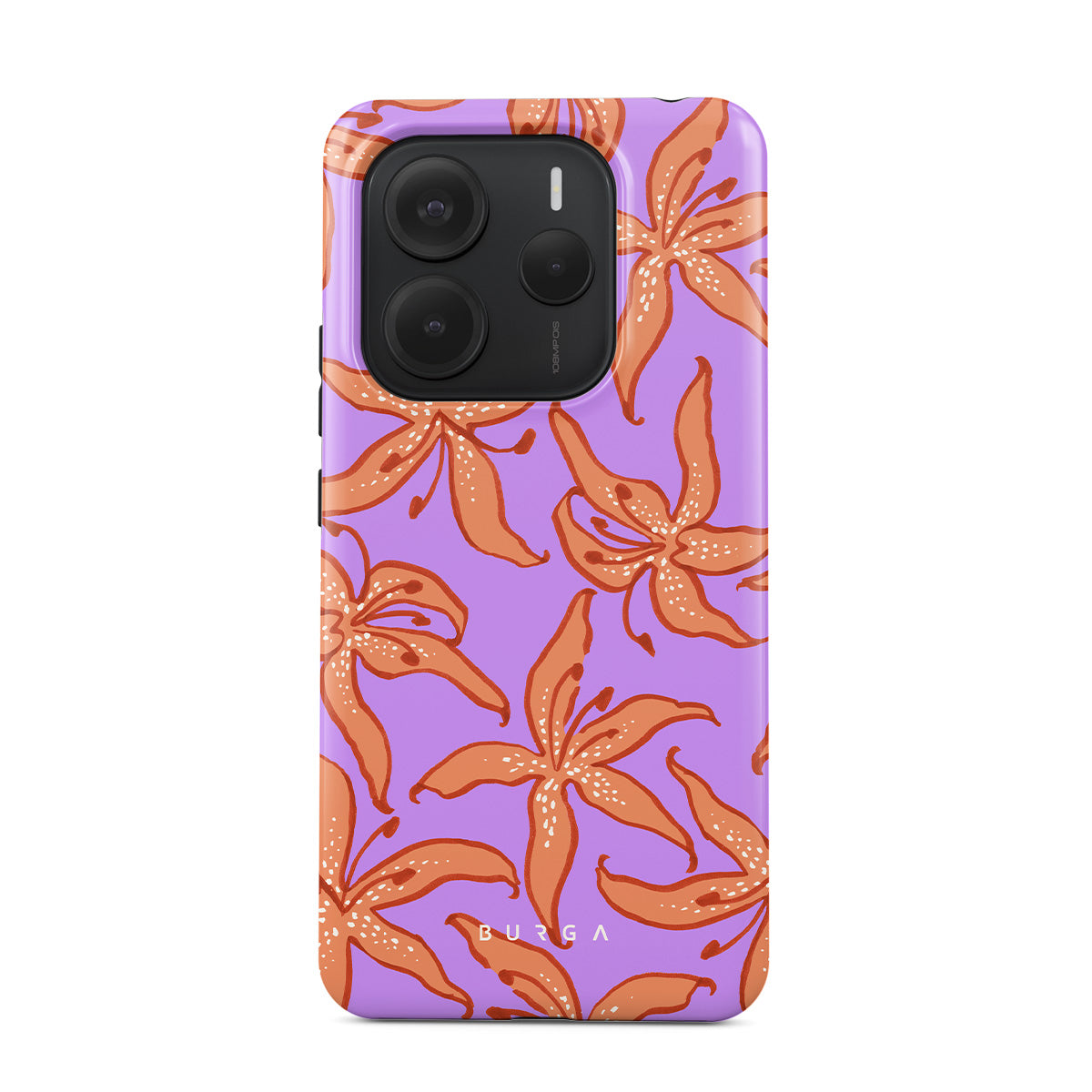 このデザインの特徴:オレンジのユリ、紫の背景があります