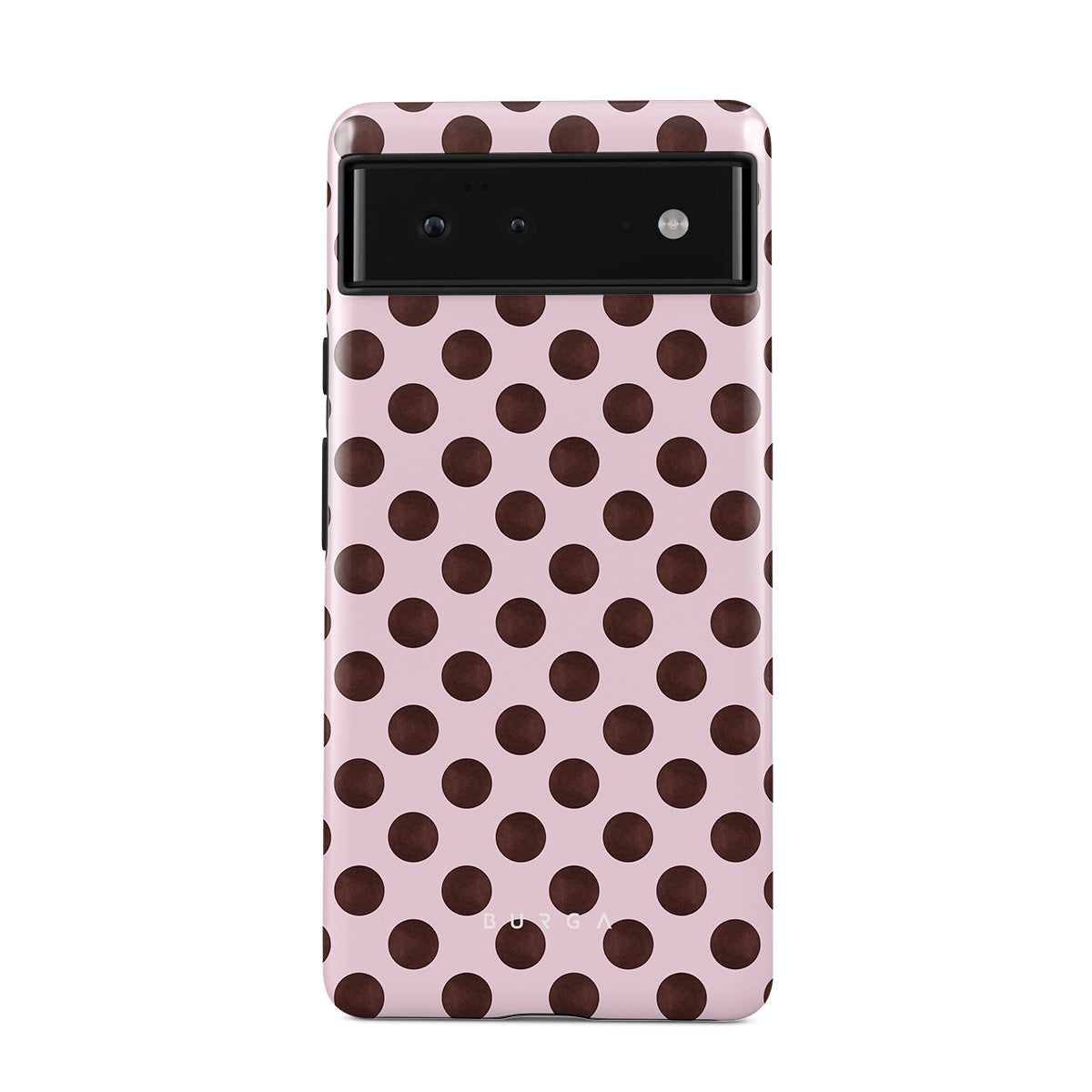 このデザインの特徴:茶色の水玉模様が施されたピンクの背景、レトロな水玉パターンが特徴です。