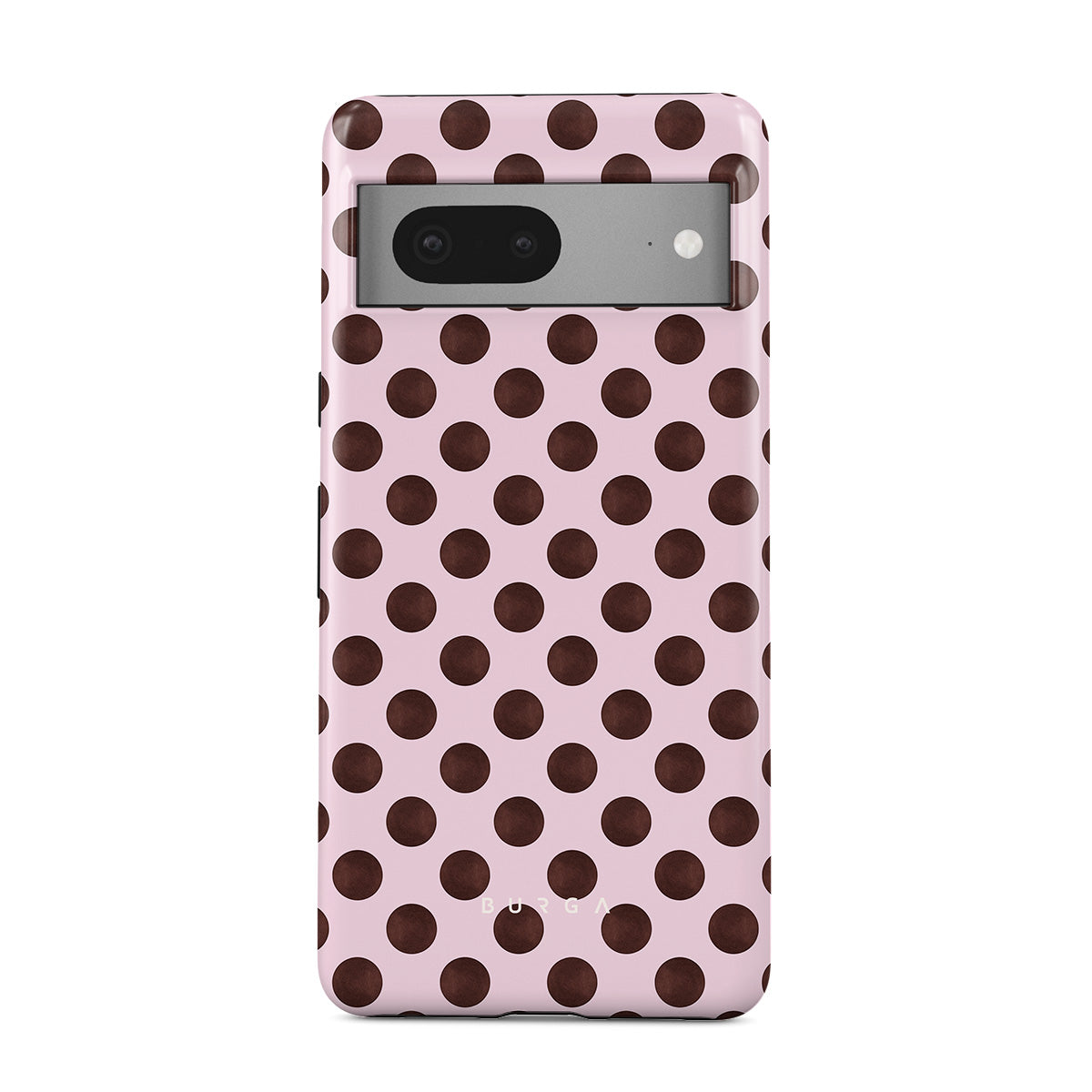 このデザインの特徴:茶色の水玉模様が施されたピンクの背景、レトロな水玉パターンが特徴です。