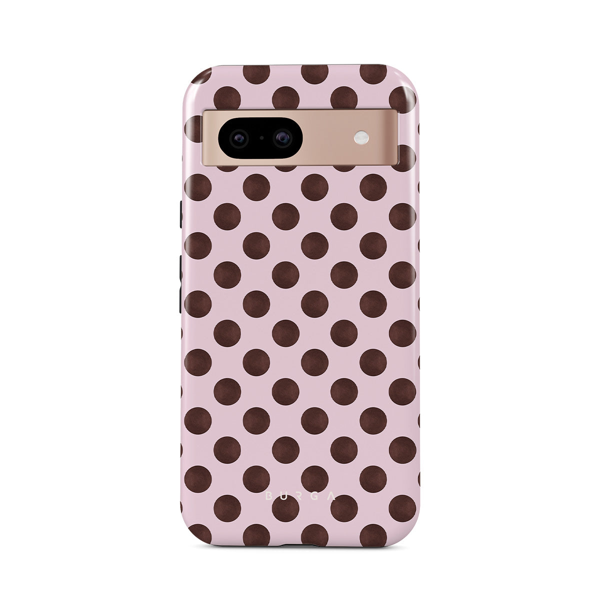 このデザインの特徴:茶色の水玉模様が施されたピンクの背景、レトロな水玉パターンが特徴です。