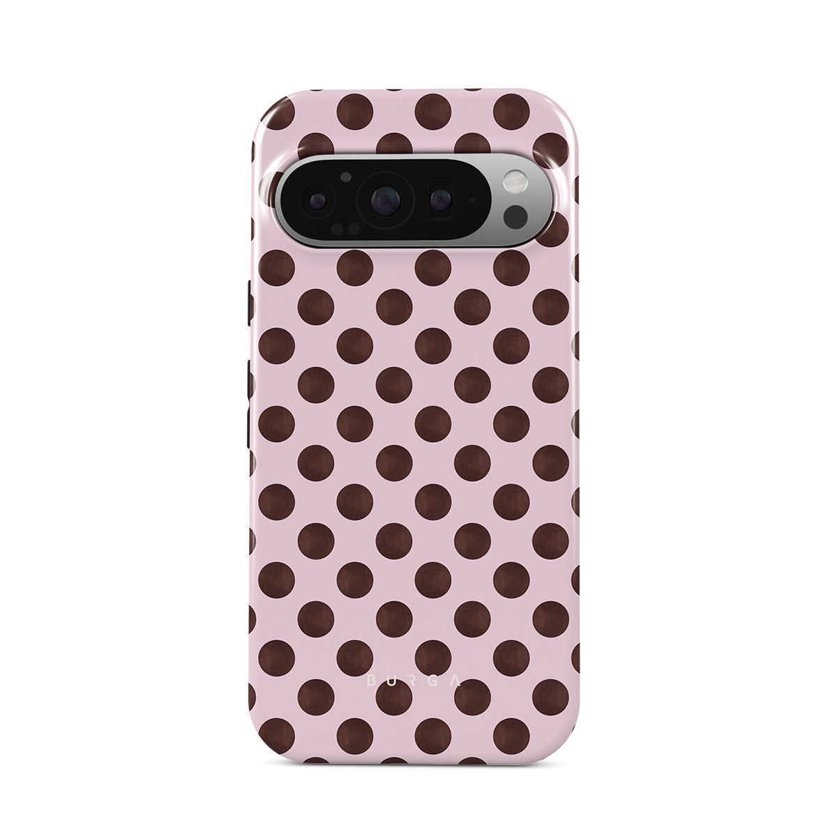 このデザインの特徴:茶色の水玉模様が施されたピンクの背景、レトロな水玉パターンが特徴です。