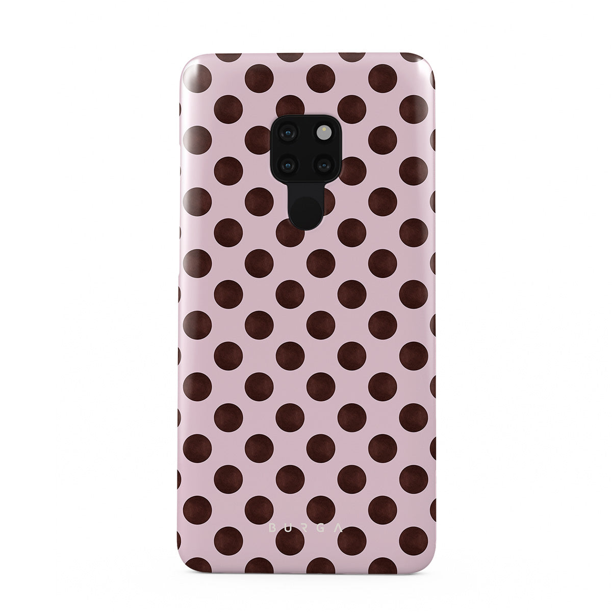 このデザインの特徴:茶色の水玉模様が施されたピンクの背景、レトロな水玉パターンが特徴です。