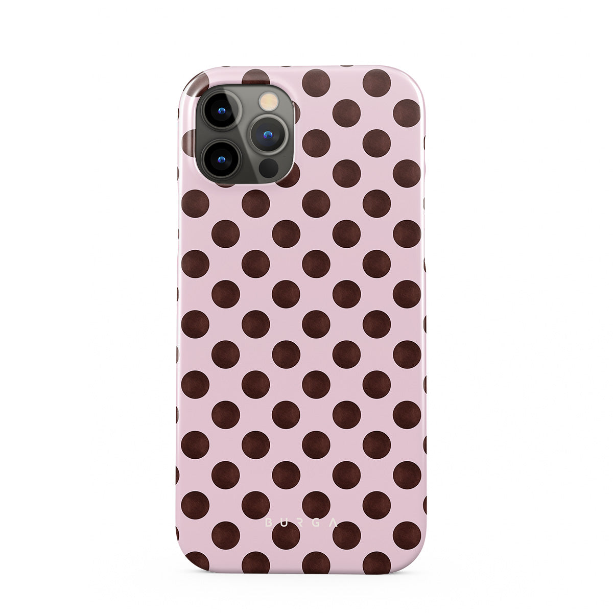 このデザインの特徴:茶色の水玉模様が施されたピンクの背景、レトロな水玉パターンが特徴です。
