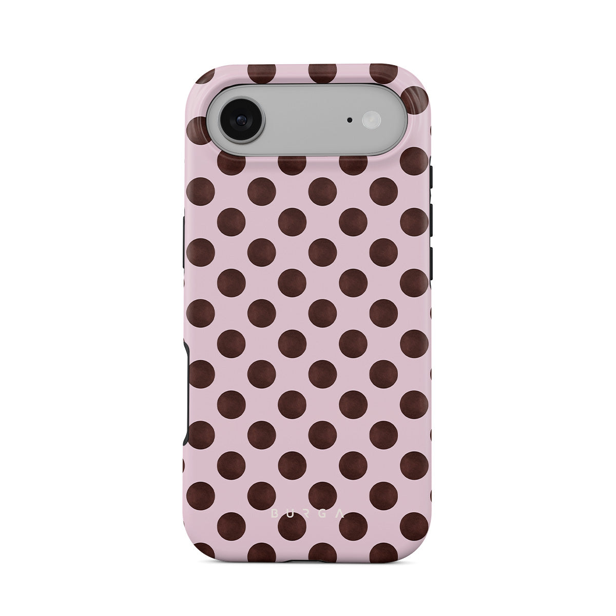 このデザインの特徴:茶色の水玉模様が施されたピンクの背景、レトロな水玉パターンが特徴です。