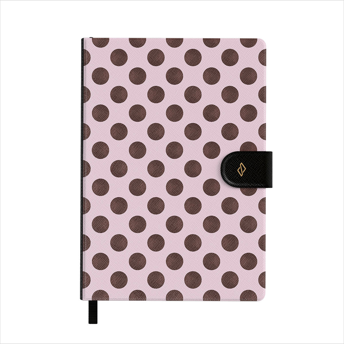 このデザインの特徴:茶色の水玉模様が施されたピンクの背景、レトロな水玉パターンが特徴です。